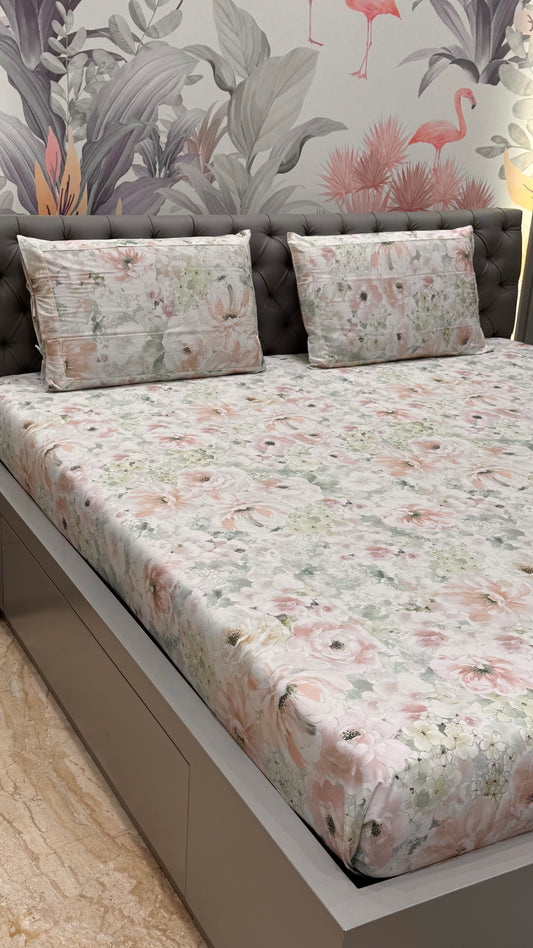 Imported Pure Cotton Satin Floral Baby Pink Bedsheet