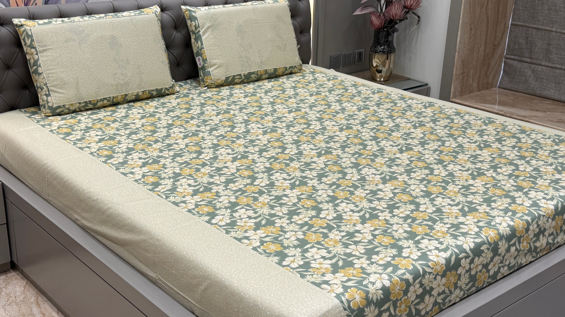 Imported Breathable Pure Cotton Foral Print Bedsheet- Green Colour