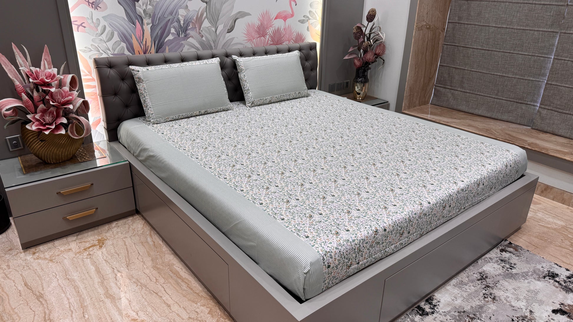Imported Cotton Mix & Match Floral Print Bedsheet- Green Colour
