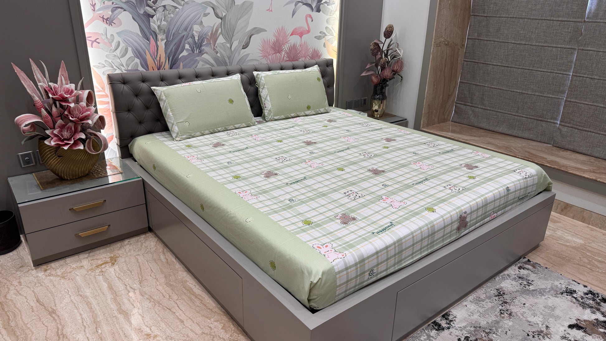 Imported Pure Cotton Mix&Match Teddy Bear Print Bedsheet- Green Colour